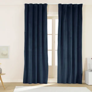 Komplet 2 zasłon SMUKEE HOME uszytych z miękkiej i połyskującej tkaniny welwetowej w kolorze granatowym to propozycja do nowoczesnych lub klasycznych wnętrz. Taśma marszcząca wszyta w górnej części umożliwia zamocowanie zasłon bezpośrednio na karniszu.