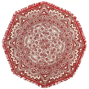 Ośmiokątny bawełniany dywan z orientalnym nadrukiem Orientalny i symetryczny wzór przypominający mandalę pomoże ci wnieść odrobinę harmonii do twojego mieszkania. Print w kremowym kolorze zainspirowany orientalnymi wzorami, kontrastujący z bazą w kolorze czerwonym tworzy intrygującą kompozycję, która z pewnością przyciągnie spojrzenia i pozytywnie wpłynie na wygląd najbliższego otoczenia. Dywan wykonany jest z bawełny, dzięki czemu jest wytrzymały i nie wymaga częstej i czasochłonnej pielęgnacji. Szczegóły: Kolor: Czerwony, Biały. Materiał: Bawełna. Skład materiału: