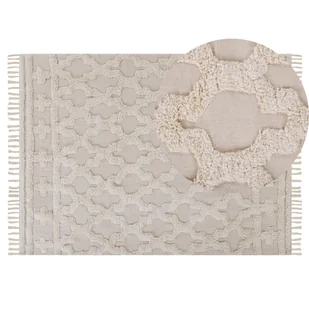 Prostokątny bawełniany dywan z teksturowaną dekoracją. Piękny dywan z krótkim włosiem może całkowicie odmienić wygląd pomieszczenia. Wykonany z naturalnej bawełny dywan jest miękki, wytrzymały i zapewnia zarówno osłonę podłogi, jak i wygodną podstawę dla stóp. Ozdobiony marokańskim motywem i frędzlami, stanie się wyjątkowym elementem dekoracyjnym w każdej przestrzeni mieszkalnej. Szczegóły: Rodzaj: Krótkie włosie Styl:
