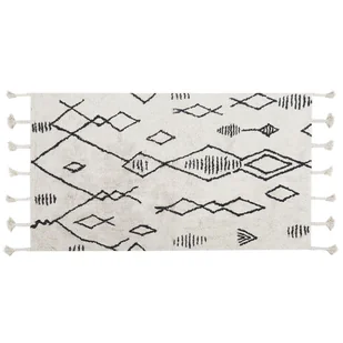 Bawełniany dywan z ozdobnymi frędzlami . Spraw, aby twoje wnętrze było ciepłe i przytulne dzięki temu miękkiemu dywanowi. Produkt posiada ładny geometryczny wzór i puszyste frędzle, które w połączeniu z neutralną paletą kolorów uzupełnią aranżacje w różnych stylach. Połóż go obok łóżka lub sofy i ciesz się jego pięknem przez długie lata. Szczegóły: Typ produktu: