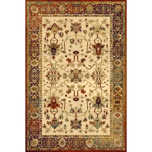 Kremowy dywan z bordową ramką i klasycznym wzorem inspirowanym naturą to elegancki detal, który wprowadza do wnętrza wyjątkowy urok. Wykonany z wysokogatunkowej wełny owczej, łączy estetykę z trwałością oraz łatwością w utrzymaniu