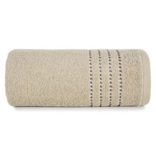 Ręcznik 50x90 Fiore beżowy 500g/m 2 Eurofirany charakteryzuje się prostotą i elegancją. Ozdobiony bordiurą w postaci cienkich paseczków, idealnie prezentuje się w nowoczesnych wnętrzach. Ręcznik doskonale wchłania wodę oraz jest niezwykle puszysty. Pomimo wielokrotnego prania, nie traci koloru i zachowuje doskonały fason przez długi czas. Rozmiar: 50x90 cm Tolerancja rozmiaru +/- 3% Skład: