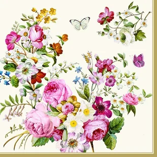 Serwetki papierowe z jasnym tłem, ozdobione motywami kolorowych kwiatów. Serwetki są trójwarstwowe i zapakowane w przeżroczystą folię. W jednym opakowaniu znajduje się 20 serwetek. Wymiary po rozłożeniu: 33 cm x 33 cm, przed rozłożeniem 16,5 x 16,5 cm Zapraszamy do zakupu również innych wzorów SERWETEK z naszej oferty.