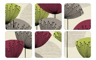 Komplet małych podstawek korkowych marki Pimpernel, ozdobionych motywem symbolicznych dmuchawców. Podkładki mają grubość 5 mm i wykonane są z czterech warstw: żaroodpornej (do 100C) i plamoodpornej warstwy lakieru, ozdobnego druku, twardej warstwy środkowej oraz korka. Podkładki są zapakowane w pudełko, które zabezpiecza je, a także zapewnia elegancką oprawę w przypadku, kiedy podkładki są przeznaczone na prezent. Podkładki nie powinny być myte pod bieżącą wodą i nie powinno się na nich umieszczać naczyń zdjętych bezpośrednio ze źródła ciepła.