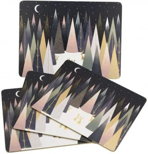 Komplet średnich podstawek korkowych marki Pimpernel, ozdobionych stylizowanym zimowym krajobrazem z motywem sosen i zajęcy. Podkładki mają grubość 5 mm i wykonane są z czterech warstw: żaroodpornej (do 100C) i plamoodpornej warstwy lakieru, ozdobnego druku, twardej warstwy środkowej oraz korka. Podkładki są zapakowane w pudełko, które zabezpiecza je, a także zapewnia elegancką oprawę w przypadku, kiedy podkładki są przeznaczone na prezent. Podkładki nie powinny być myte pod bieżącą wodą i nie powinno się na nich umieszczać naczyń zdjętych bezpośrednio ze źródła ciepła.