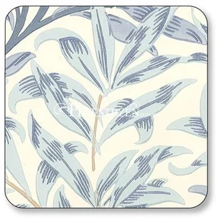 Komplet małych podstawek korkowych na stół firmy Pimpernel, ozdobionych motywem gałązek wierzby z XIX-wiecznej angielskiej tapety z epoki wiktoriańskiej, zaprojektowanej przez Williama Morrisa. Listki wierzby są w kolorze niebieskim. Podkładki mają grubość 5 mm i wykonane są z czterech warstw: żaroodpornej (do 100C) i plamoodpornej warstwy lakieru, ozdobnego druku, twardej warstwy środkowej oraz korka. Podkładki są zapakowane w pudełko, które zabezpiecza je, a także zapewnia elegancką oprawę, w przypadku, kiedy podkładki są przeznaczone na prezent.