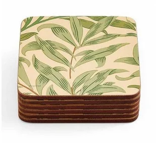 Komplet dużych podstawek korkowych na stół firmy Pimpernel, ozdobionych wzorem zielonych gałązek wierzby z XIX-wiecznej angielskiej tapety z epoki wiktoriańskiej, zaprojektowanej przez Williama Morrisa. Podkładki mają grubość 5 mm i wykonane są z czterech warstw: żaroodpornej (do 100C) i plamoodpornej warstwy lakieru, ozdobnego druku, twardej warstwy środkowej oraz korka. Podkładki są zapakowane w pudełko, które zabezpiecza je, a także zapewnia elegancką oprawę, w przypadku, kiedy podkładki są przeznaczone na prezent. Podkładki nie powinny być myte pod bieżącą wodą i nie powinno się na nich umieszczać naczyń zdjętych bezpośrednio ze źródła ciepła.