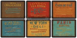 Komplet średnich podstawek korkowych firmy PIMPERNEL. Różnokolorowe podkładki zostały ozdobione napisami - nazwami różnych knajpek z całego świata oraz charakterystycznym dla nich menu. Podkładki mają grubość 5 mm i wykonane są z czterech warstw: żaroodpornej (do 100C) i plamoodpornej warstwy lakieru, ozdobnego druku, twardej warstwy środkowej oraz korka. Podkładki są zapakowane w pudełko, które zabezpiecza je, a także zapewnia elegancką oprawę w przypadku, kiedy podkładki są przeznaczone na prezent.
