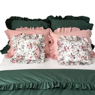 Pościel Bawełniana Z Falbanką Komplet Do Sypialni + 6 Poduszek 160X200 Butelkowa Zieleń Retro Kwiaty