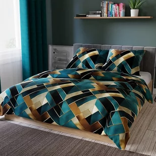 Pościel satynowa RUBIK - Geometryczne gładkie kolory w odcieniach turkusu i złota - 220 x 200 cm