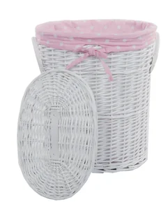 Wiklinowy kosz na praniew kolorze białymnadaje się do łazienki, salonu, sypialniWymiary: WxDxH 46x34x55cmPojemność 60Lz pokrywą w kolorze jasnoróżowym z białymi kropkami, zdejmowaną i nadającą się do praniaz pokrywąz uchwytami do przenoszenia