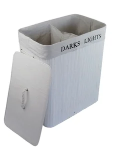 Kosz na pranie Skrzynia na pranie składana z pokrywą Uchwyt do powieszeniaKosz na pranie wykonany z bambusa, białydostępne 2x przegródki do sortowania,prostokątny WxDxH 52x32x63cm, duża pojemność 100L,Dostępny worek na pranie w kolorze kremowej bieli, zdejmowany i nadający się do praniaDostępna pokrywa i uchwyt, praktyczne do przenoszeniaLekki, ale wytrzymały, metalowy pierścień zapewnia dodatkową stabilność kosza na pranie