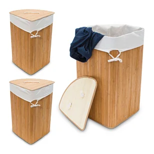 Przynieś do domu idealny kosz na pranie do sypialni, łazienki lub pralni. Wykonany z bambusa, ma efekt dekoracyjny i jest również idealny do wilgotnych pomieszczeń. Dzięki trójkątnej konstrukcji, kosz na pranie jest idealnym rozwiązaniem oszczędzającym miejsce. Wykorzystaj w pełni nisze i narożniki w małych pomieszczeniach. Narożny kosz na pranie oferuje dużo miejsca na brudną bieliznę, którą można ukryć za pomocą pokrywy.