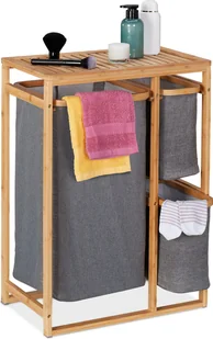 Relaxdays Kosz na pranie, bambus, 3 półki, wys. x gł.: 70 x 50 x 30,5 cm, regał łazienkowy z koszem na pranie, kolor naturalny/szary