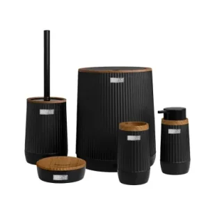 Zestaw akcesoriów łazienkowych Nida w stylu nowoczesnym, w eleganckim kolorze czarnym z drewnianymi akcentami, to idealne rozwiązanie dla osób ceniących styl i funkcjonalność. Zestaw składa się z pięciu elementów: kosza na śmieci, dozownika na mydło, kubka na szczoteczki, mydelniczki oraz szczotki do WC. Każdy element wykonany jest z wysokiej jakości materiałów, co gwarantuje trwałość i łatwość w utrzymaniu czystości. Dzięki neutralnej kolorystyce i eleganckiemu wykończeniu, zestaw doskonale komponuje się z różnorodnymi aranżacjami łazienkowymi, dodając im nowoczesnego charakteru i stylu.