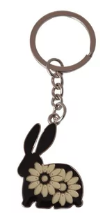 Metalowy breloczek - królik, czarny w białe kwiatki. Wymiary bez kółka: 4x3cm.