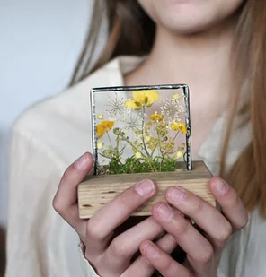 Dekor Kompozycja jaskrów z drewnianą podstawką