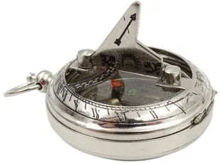 Srebrzysty zegar słoneczy z kompasem NC1028 Przedstawiany zegar słoneczny to tzw. zegar słoneczny Dollonda. Dzięki kompasowi istnieje możliwość usytuowania urządzenia w linii północ - południe. Dzięki temu po podniesieniu do pionu gnomonu - trójkątnego, ruchomego wskaźnika na topie promienie słońca rzucą cień na zewnętrzną tarczą urządzenia, gdzie zaznaczone są godziny. Można wówczas odczytać aktualny czas.