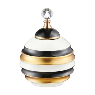 Pojemnik dekoracyjny ceramiczny o wysokości 26 cm - MIKO Oryginalny pojemnik dekoracyjny, wykonany z ceramiki zdobionej ręcznie. Posiada przykrywkę z efektownym, kryształowym uchwytem. Połączenie bieli, czerni i matowego złota sprawia, że pojemnik prezentuje się elegancko i stylowo. Pojemnik Miko jest doskonałą propozycją na nietuzinkowy prezent. Na spodzie amfory przymocowane są miękkie podkładki zabezpieczające meble przed zarysowaniem.