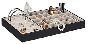 Szukasz praktycznego sposobu na przechowywanie ulubionej biżuterii? Dzięki tej praktycznej kasetce na biżuterię zawiązane naszyjniki lub porysowana biżuteria należą już do przeszłości. Przejrzysty podział na poszczególne przegródki zapewnia wystarczającą i bezpieczną przestrzeń do przechowywania pierścionków, naszyjników i kolczyków. Oznacza to, że biżuteria jest zawsze na widoku i zawsze pod ręką. Dzięki zajmującej niewiele miejsca konstrukcji, pudełko na biżuterię z łatwością zmieści się w każdej szufladzie. Materiały ze sztucznej skóry i aksamitu nadają kasetce na biżuterię ponadczasowej elegancji, a także chronią biżuterię przed zarysowaniami.