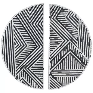 Dekoracja w kształcie dwóch połówek koła. Jeżeli szukasz wyjątkowych akcesoriów do udekorowania ściany w salonie lub sypialni, to ta dekoracja będzie świetnym wyborem. Składa się z dwóch połówek, które razem tworzą okrąg. Geometryczny, biało–czarny wzór wniesie egzotyczny akcent do aranżacji i z pewnością przyciągnie uwagę niejednej osoby. Z kolei specjalne haczyki, znajdujące się na tyle, ułatwią zawieszenie dekoracji.