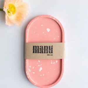 Taca dekoracyjna owalna, wykonana została ręcznie z gipsu polimerowego, który jest materiałem naturalnym dlatego kolor może nieznacznie różnic się od tego prezentowanego na zdjęciu, a malutkie bąbelki powietrza są naturalnymi cechami dla tego materiału. Tace są zaimpregnowane dlatego nie pochłaniają wilgoci. Produkt jest przyjazny środowisku, jest bezzapachowy. Zestaw zawiera sztuk: 1 Wymiary: Szerokość: 9,5 cm, Długość: