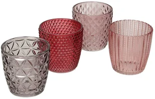 Oryginalny komplet szklanych świeczników we wzory. Zestaw czterech świeczników wykonanych ze szkła w kolorze różowym to wspaniała alternatywa dla tradycyjnych lampionów. Każdy świecznik posiada inny, różniący się od pozostałych, wypukły wzór. Świecznik tealight sprawdzi się w salonie i sypialni tworząc nastrojową atmosferę pełną przytulności i ciepła. Wymiary: 1szt. : śr. 7cm, wys. 7cm; waga 0,16kg.