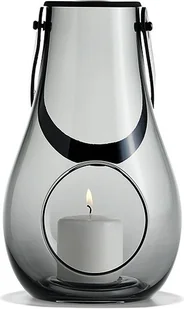 Lampion wykonany został z ręcznie dmuchanego szkła w odcieniu dymnym (szarym). Posiada uchwyt ze skóry naturalnej i nasadkę w kolorze czanrym. Wymiary: wysokość 25 cm. Projekt: Maria Bernsten. . .