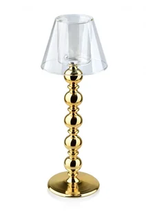 Szklany lampion imitujący lampkę nocną z serii MARY GOLD marki MONDEX. Lampion jest jednoelementowy, posiada złotą nogę i szklany przeźroczysty klosz. Pasuje do niego świeczka tea light lub wąski walec. Wymiary: średnica: 11.8cm wysokość: 33cm