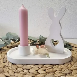Zajączek-do dekoracji,świecznik Wymiary: Taca-17x9 cm Zajączek-wysokość-7,5 cm Średnica miejsca na świeczkę = -2cm Zestaw wykonany z olbrzymią starannością i...