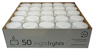Tealighty Nightlight Paraffin o ponadprzeciętnym czasie palenia 50 sztukTe tealighty parafinowe Nightlight mają średnicę 38 mm i wysokość 24 mm. Jedno opakowanie zawiera 50 sztuk. Parafina Nightlight zapewnia ponadprzeciętny czas palenia wynoszący 7-8 godzin. Przezroczysta obudowa zapewnia jeszcze lepszy efekt świetlny, dzięki czemu podgrzewacze idealnie nadają się do branży hotelarskiej i gastronomicznej oraz do wszelkich dekoracji stołu. Podgrzewacze są nieodzowną częścią nastrojowych dekoracji, a gdy są używane w odpowiednich świecznikach, są indywidualnym i stylowym elementem przyciągającym wzrok i wyczarowującym przytulną, przyjemną atmosferę w mgnieniu oka.