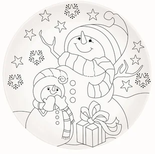 Porcelanowy talerzyk, z kolekcji ART & COLOUR ŚWIĘTA, w kolorze białym, ozdobiony czarnym konturem bałwanków. Dostępny wraz z zestawem farb i pędzelkiem - do własnoręcznego pomalowania. Talerz znajduje się w pudełeczku, z podobnym motywem.