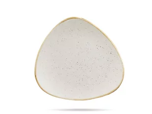Talerz trójkątny 31 cm Barley White CHURCHILL Oryginalny, trójkątny talerz o średnicy 31 cm, w kolorze Barley White, pochodzący z serii Stonecast, firmy Churchill. Kolor Barley White to jasny odcień kremowej porcelany, ozdobionej ręcznie nakrapianym wzorem, z brązowym (jaśniejszym lub ciemniejszym) rantem. Stonecast to jedna z najbardziej popularnych linii brytyjskiej firmy Churchill. Dostępna w wielu ciekawych kolorach, inspirowanych naturalnymi barwami, które można ze sobą łączyć, tworząc niebanalne kompozycje na stole. Delikatnie rustykalny styl Stonecast dodaje porcelanie charakteru.