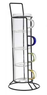 Komplet 4 szklanek do espresso i innych napojów z kolorowymi uchwytami i metalowym stojakiem