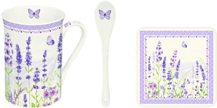 Wykonany z porcelany elegancki kubek z łyżeczką i podkładką korkową, z kolekcji Lavender Field, w kolorze białym, ozdobiony motywem lawendowej łąki i lawendowego pejzażu. Kubek znajduje się w bardzo ładnym pudełku z tym samym wzorem. Pojemność kubka: ok. 285 ml Wysokość kubka: 10,6 cm, średnica 7,8 cm Łyżeczka porcelanowa: