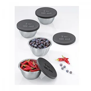 KUCHENPROFI Zestaw 4 stalowych miseczek z pokrywkami 100 ml Producent: Kuchenprofi Kod produktu: KU-0912112804 Materiał: Stal nierdzewna, tworzywo sztuczne Ilość elementów: 8 Pokrywka:
