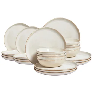 Ręcznie robiony komplet obiadowy dla ośmiu osób. Dodaj ciepła i elegancji swojemu stołowi dzięki temu ręcznie wykonanemu, 24-elementowemu zestawowi naczyń kamionkowych. Delikatne kremowe szkliwo i subtelnie postarzane krawędzie nadają mu naturalny, rzemieślniczy urok. Zestaw zawiera duże, małe i głębokie talerze idealne na co dzień i na wyjątkowe okazje. Trwała kamionka sprawia, że nadaje się do kuchenki mikrofalowej i zmywarki, łącząc styl z funkcjonalnością.