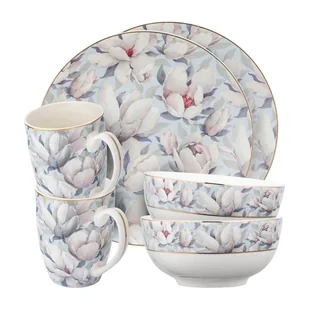 Śniadaniowy komplet ALTOM DESIGN w błękitnym kolorze z motywem magnolii dla 2 osób to wszystko, czego potrzeba do spokojnego, eleganckiego poranka. Zestaw składa się z 6 elementów wykonanych z porcelany: 2 talerzy o średnicy 20 cm, 2 misek 14 cm oraz 2 kubków o pojemności 350 ml.
