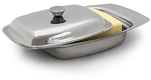 Zestaw jest wykonany z polerowanego metalu. Maselniczkę można myć w zmywarce. Błyszczący pojemnik na masło może być również jako stylowe naczynie do serwowania masła ziołowego i sera. Szczegółowy wygląd maselniczki z uchwytem - Wymiary wys. x szer. x gł. : ok. 6 x 19,5 x 13 cm - Waga: