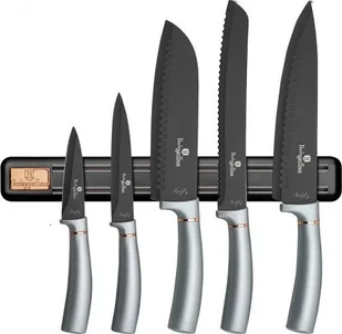 Zestaw 5 noy z listw magnetyczn firmy BERLINGER HAUS z serii Moonlight Collection. Przeznaczone do porcjowania misa i ryb, krojenia pieczywa oraz obierania i siekania warzyw. Noe ze stali nierdzewnej dodatkowo pokryte powok nieprzywierajc non-stick. Wyposaone w uchwyty pokryte bardzo trwa cienk warstw silikonu dla uzyskania pewnego trzymania w kadych warunkach. Cechy: Materia: stal nierdzewna z powok non-stickIdealnie nadaj si do codziennego uytku,Ostrza ze stali nierdzewnej zapewniaj si i trwaoNie utrzymuj zapachw ywnoci,Nie zostawi plam,Ergonomiczny uchwyt SOFT TOUCH dla wygody podczas cicia.