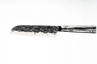 Z tym japońskim nożem Santoku firmy Forged o długości ostrza 18 cm można wygodnie posiekać dowolne warzywa, mięso, ryby, grzyby lub zioła do przygotowania (nie tylko) kuchni azjatyckiej. Noże z serii Brute charakteryzują się kunsztem wykonania - posiadają niepolerowaną rękojeść przechodzącą w ostrze. Surowy wygląd stali i szczegóły ręcznego wykonania są naprawdę wyjątkowe. Holenderska marka Forged charakteryzuje się wyjątkowymi, fantazyjnymi nożami, które wykonywane są ręcznie z japońskiej stali. Są to produkty unikalne i wysokiej jakości, nie tylko w zakresie Materiałów, ale również wykonania.