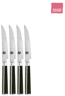 Każdy koneser może powiedzieć z własnego doświadczenia, jak bardzo cierpi przyjemność z wysokiej jakości steku, jeśli jakość noża nie jest odpowiednia. Znakomite noże do steków o poręcznym formacie, zakrzywionym ostrzu i wąskiej konstrukcji nie rozrywają mięsa, ale kroją je bez miażdżenia. Zawartość zestawu: 4 x noże do steków DM-0711 (ostrze 5,0" / 12,5 cm, rękojeść 10,4 cm)Seria Shun Classic - seria Damascus z 27 kształtami ostrzy Twardość 61 (±1) HRCSeria noży szefa kuchni Shun jest jedną z najbardziej wszechstronnych serii noży damasceńskich na świecie i jest bardzo popularna wśród elity szefów kuchni i ambitnych kucharzy hobbystów. Profesjonalne noże szefa kuchni Shun są wykonane ze specjalnie opracowanej, nierdzewnej stali damasceńskiej składającej się z 32 warstw.