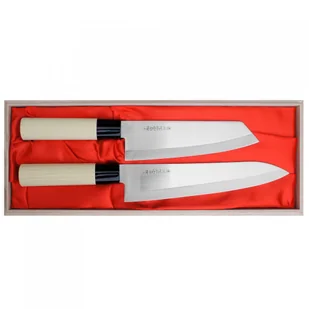 Zestaw 2 noży Japońskich w drewnianym prezentowym pudełkuZestaw 2 noży kuchennych zapakowany w tradycyjne drewniane opakowanie idealnie nadaję się na prezent dla każdego miłośnika gotowania. Noże wykonane ze stali 420J2 hartowane do twardości 56 HRC, są idealne do środowiska domowego. Satake Megumi Nóż kuchenny Szefa kuchni 21 cmOstrze - stal 420J2Rękojeść - drewno magnoliowe pierścień z tworzywaTwardość - 56 HRC +/- 1Długość całkowita - 33,8 cmDługość ostrza - 21 cmSzerokość klingi - 4,6 cmGrubość klingi - 1,6 mmSposób ostrzenia - szlif dwustronny symetrycznyWaga - ok. 118 gSatake Megumi Nóż kuchenny Santoku Bunka 17 cmOstrze - stal 420J2Rękojeść - drewno magnoliowe pierścień z tworzywaTwardość - 56 HRC +/- 1Długość całkowita - 29,7 cmDługość ostrza - 17 cmSzerokość klingi - 4,9 cmGrubość klingi - 1,5 mmSposób ostrzenia - szlif dwustronny symetrycznyWaga - ok. 117 g. . .