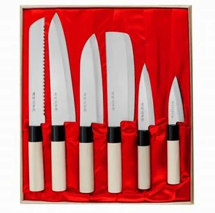 W skład zestawu wchodzi: Satake Megumi 420J2 Nóż do pieczywa 20 cmSatake Megumi 420J2 Nóż Szefa kuchni 21 cmSatake Megumi 420J2 Nóż Santoku 17 cmSatake Megumi 420J2 Nóż Nakiri 16 cmSatake Megumi 420J2 Nóż uniwersalny 12 cmSatake Megumi 420J2 Nóż Ajikiri 9 cm. . .