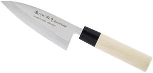 Satake S/D Leworęczny Nóż kuchenny Deba 12 cmTradycyjny japoński nóż z grubą, zwężającą się klingą, który służy do odgławiania i filetowania ryb w taki sposób, żeby nie uszkodzić ich delikatnego mięsa. W Japonii bywa często używany do sprawiania mięsa drobiowego, ale nie jest klasycznym tasakiem i nie powinno się nim mocno uderzać. Aby przeciąć ość, wystarczy lekko nacisnąć grzbiet noża i wykonać szybkie, precyzyjne cięcie. Ostry czubek i krótkie ostrze ułatwiają kontrolę ruchów, co jest szczególnie ważne, gdy trzeba dostać się nożem do ciasnych miejsc. Nóż przeznaczony dla osób leworęcznych.