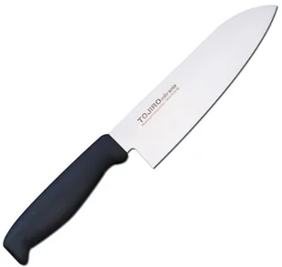 Tojiro Color Nóż kuchenny Santoku 17 cm Wielofunkcyjny japoński nóż kuchenny, przeznaczony do krojenia warzyw, mięsa i ryb. Posiada obniżony czubek, który znacznie ułatwia szatkowanie, oraz szerokie ostrze, na które można zgarnąć pokrojone produkty, żeby je przenieść np. do sałatki. Nóż Santoku doskonale się sprawdza w każdych warunkach pracy, ponieważ dzięki wysoko położonej rękojeści palce nie dotykają deski ani jedzenia. Dane techniczne: