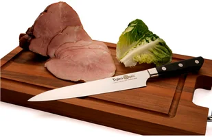 Nóż do porcjowania DP3 o dlugości 21cm marki Tojiro. Jest to nóż zarówno dla profesjonalnych kucharzy, jak i osób zaczynających swoją przygodę z gotowaniem. Dzięki długiemu, gładkiemu ostrzu łatwo kroi się mięso na równe porcje. Ostrze zostało wykonane z trzywarstwowej stali nierdzewnej, a rękojeść z laminatu typu Micarta.