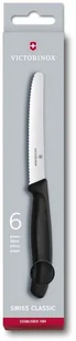 1. Sześć noży stołowych i pomidorów z ząbkowaną krawędzią ostrza, 11 cm- ergonomiczna rękojeść z materiału syntetycznego (PP) w kolorze czarnym- nadaje się do mycia w zmywarceSzwajcarską firmę Victorinox w 1884 roku założył Karl Elsener. Od samego początku firma zajmowała się produkcją noży, a w 1891 roku wyprodukowała pierwszą kolekcję scyzoryków, które do dnia dzisiejszego cieszą się dużym uznaniem na świecie oraz stanowią wyposażenie Armii szwajcarskiej. Wszystkie produkty firmy wytwarzane są w Szwajcarii z najwyższej jakości materiałów. Produkty firmy Victorinox objęte są dożywotnią gwarancją producencką.