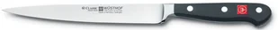 Nóż do mięsa Classic to smukły nóż z mocnym, długim ostrzem i delikatną krawędzią. Nadaje się do przygotowywania wszystkich rodzajów mięsa oraz do porcjowania pieczeni. Seria Classic Wysokiej jakości kute noże od firmy Solingen Doskonale wyważone, o wyjątkowej ergonomii Dla profesjonalnych kucharzy i entuzjastów kuchni Czarna rękojeść wykonana z specjalnego materiału syntetycznego Klasyczny wygląd z trzema nitami, dobrze leży w dłoni Wykonany z wysokiej jakości niemieckiej stali stopowej X50CrMoV15 Nadzwyczajne ostrze, które jest łatwe w utrzymaniu Twardość 58 HRC w skali Rockwella Specjalny, sterowany komputerowo proces ostrzenia PEtec Precyzyjnie ręcznie gładzone i polerowane dla uzyskania doskonałej krawędzi Ścisła ciągła kontrola jakości, ostrze sprawdzane laserem Standardowy kształt nasady noża zapewnia pewny chwyt Płynne przejście między osłoną a rękojeścią Gładkie, higieniczne mocowanie rękojeści Noże można myć w zmywarce, jednak zaleca się mycie ręczne Szeroka gama produktów stworzonych we współpracy z profesjonalnymi szefami kuchni Przedłużona gwarancja na wady produkcyjne i materiałowe na 15 lat Seria ta otrzymała wyróżniający znak jakości i higieny NSF w USA Seria noży Classic doskonale prezentuje sztukę wytwarzania noży firmy WÜSTHOF. Jest to najbardziej popularna seria w ofercie WÜSTHOF i to nie tylko ze względu na wysoki komfort użytkowania. Są to klasyczne noże z nitowanymi rękojeściami, których ostrza wykute są z jednego kawałka stopu stali nierdzewnej X50CrMoV15.