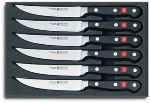Noże do steków Classic wyposażone są w solidne, wąskie ostrze. Mają one szlifowany grzbiet i prostą krawędź. Tnie steki i kotlety bez wysiłku. Nadaje się do grillowanego mięsa. Seria klasyczna Wysokiej jakości noże kute w Solingen Doskonale wyważone, o wyjątkowej ergonomii Dla profesjonalnych kucharzy i entuzjastów kuchni Czarna rękojeść wykonana z specjalnego Materiału syntetycznego Klasyczny wygląd z trzema nitami, dobrze leży w dłoni Top niemiecka stal stopowa X50CrMoV15 używana Nadzwyczajne ostrze, które jest łatwe w utrzymaniu Twardość 58 HRC w skali Rockwella Specjalny, sterowany komputerowo proces szlifowania PEtec Precyzyjne ręczne gładzenie i polerowanie dla uzyskania doskonałej krawędzi Ścisła ciągła kontrola jakości, ostrze sprawdzane laserem Standardowy kształt osłony zapewnia pewny chwyt Płynne przejście między osłoną a rękojeścią Bezszwowe, higieniczne mocowanie smoczków Noże można myć w zmywarce, jednak zaleca się mycie ręczne Szeroka gama produktów stworzonych we współpracy z profesjonalnymi szefami kuchni Przedłużona gwarancja na wady produkcyjne i Materiałowe na 15 lat Seria ta otrzymała wyróżniający znak jakości i higieny NSF w USA Seria noży Classic doskonale prezentuje sztukę nożowniczą firmy WÜSTHOF.
